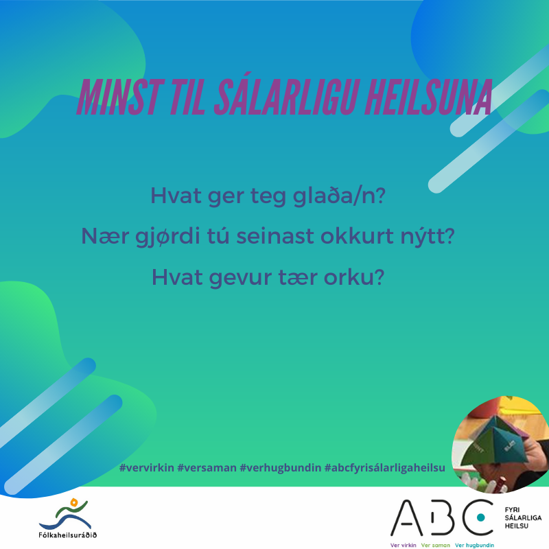 Boðskapurin í ABC fyri sálarliga heilsu um at vera virkin saman um okkurt, sum vit tíma, kann vera avbjóðandi, nú nógv uppliva, at vit ikki kunnu vera saman við so nógvum fólkum og møguliga er frítíðarvirksemi, sum hugbindur avlýst vegna korona. Tí kann tað vera torført at menna sálarligu heilsuna.