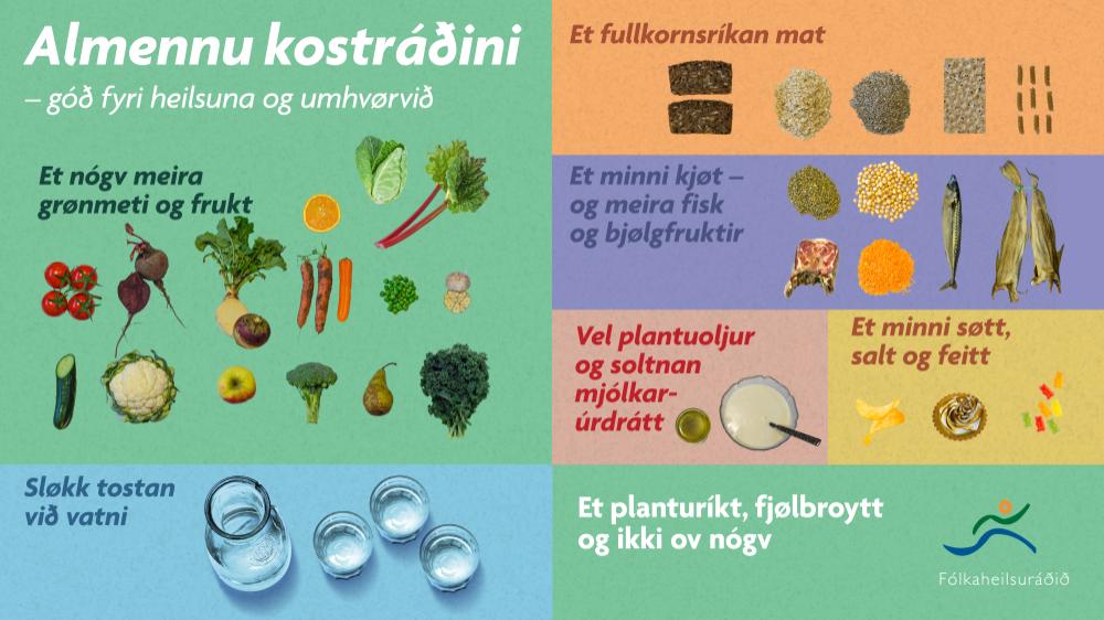 Eins og onnur lond hava vit valt at taka umhvørvisliga sjónarhornið við í kostráðini og vísa á, hvussu vit kunnu vera umhvørvisvinarlig, tá ið vit velja, hvat vit eta. Alt, sum vit eta og drekka, hevur stóran týdning fyri umhvørvið. Hetta kemst av, at framleiðslan av matvørum elvir til útlát av vakstrahúsgassi, og kallast hetta matvørukolevnisfótaspor.