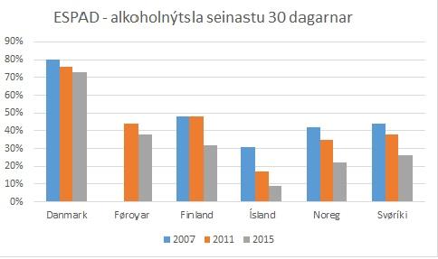 Eins og hini norðurlondini, so hava Føroyar eitt fall í rúsdrekkanýtsluni hjá ungum, men Ísland raslar niðureftir í mun til hini. Hetta vísa hesar tríggjar ESPAD kanningarnar um drykkimynstri hjá ungum yvir 30 dagar.